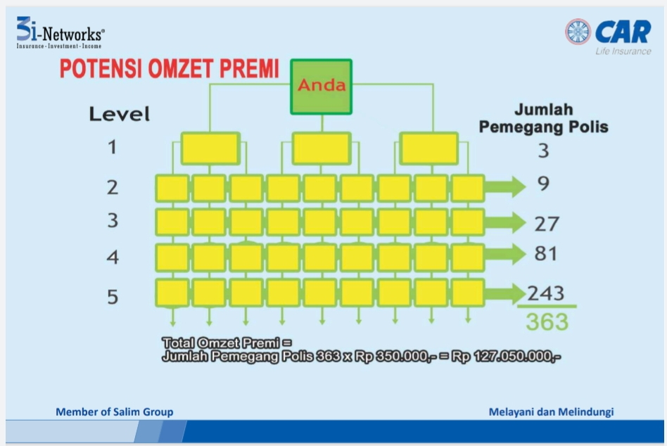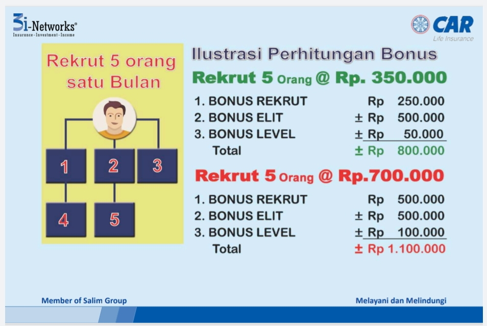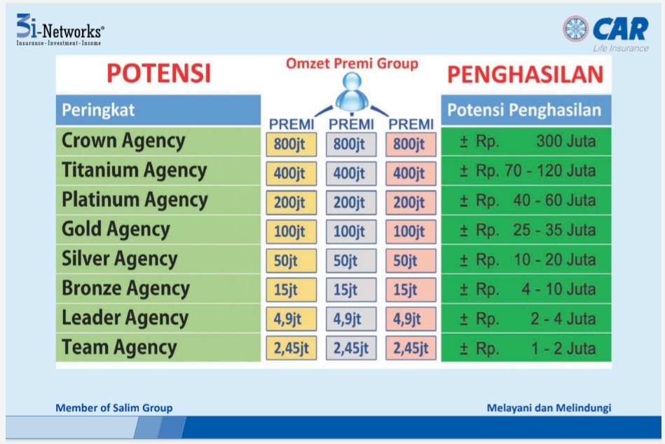 - Potensi peluang penghasilan bulanan sebagai agen asuransi berlisensi AAJI yang bertambah besar setiap bulan sesuai dengan perkembangan perekrutan dan dapat diwariskan.